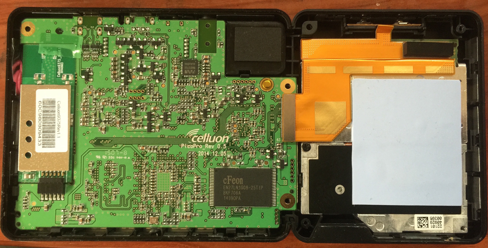 Pictures of the top and bottom of the Celluon PCB. Bottom image is reversed right to left to line up with the top image. Click for larger versions.